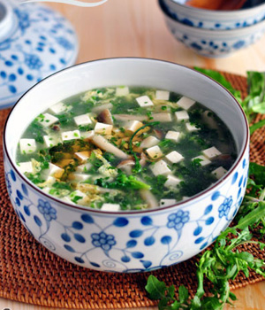 2、锅中加水,放入植物油,接着放入菱角菜,再煮沸,倒入鸡蛋稍煮片刻,加入精盐,味精,盛入大汤碗内即成。