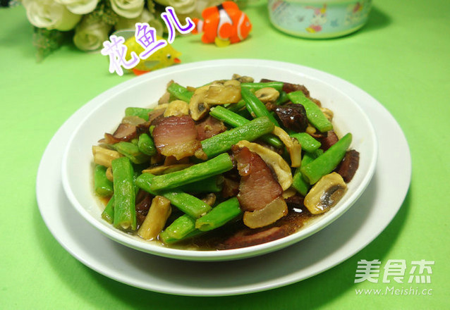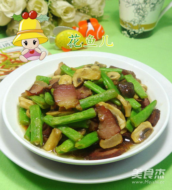 这种豆角在阿拉宁波叫梅豆,它含丰富维生素B、C和植物蛋白质,能使人头脑宁静.调理消化系统,消除胸膈胀满。这次是配上蘑菇和酱肉来炒炒,家常好味道,下饭。。。