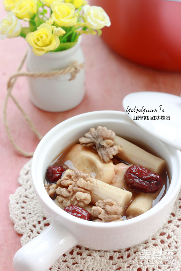 山药具有健脾渗湿,涩肠止泻的作用,山药含有粘液蛋白,有降低血糖的作用,可用于治疗糖尿病,是糖尿病人的食疗佳品。红枣养血益气补中,核桃润燥化痰,温肺润肠,治虚寒喘咳。