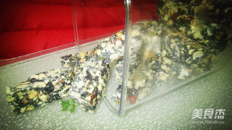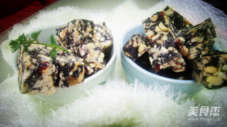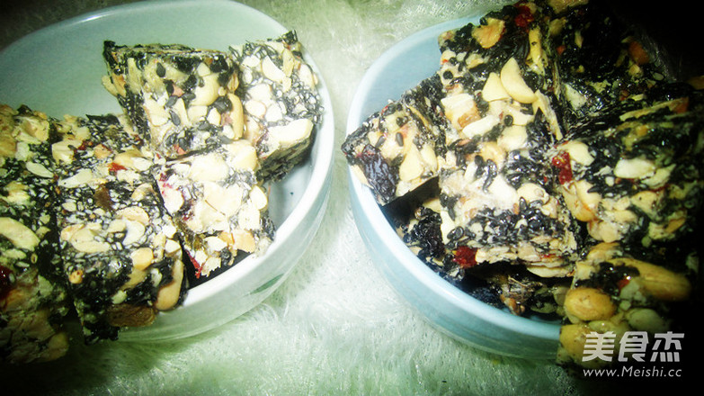 花生要烤熟去皮,稍微压碎,拌入葡萄干黑加仑枸杞和蔓越莓,熬糖稀时候麦芽糖不能太多,多了粘牙不酥脆了。熬糖稀要小火熬制,一直把水分熬干,不要太搅动,糖稀有点发黄了,关火,倒入花生和黑芝麻拌匀,倒在容器里压紧就可以了。