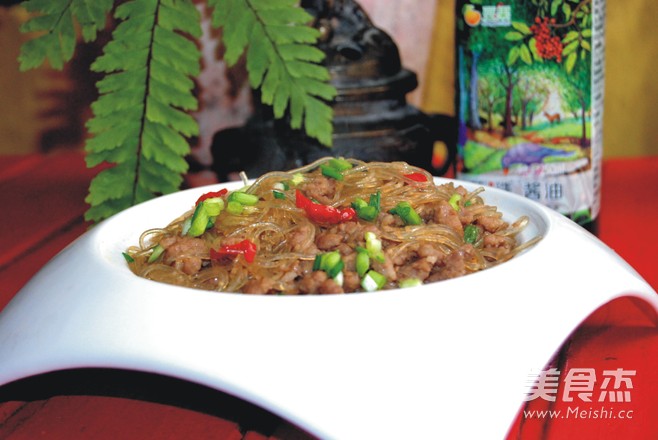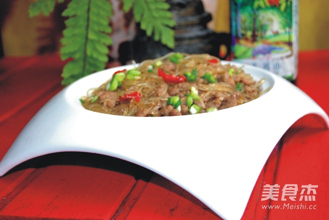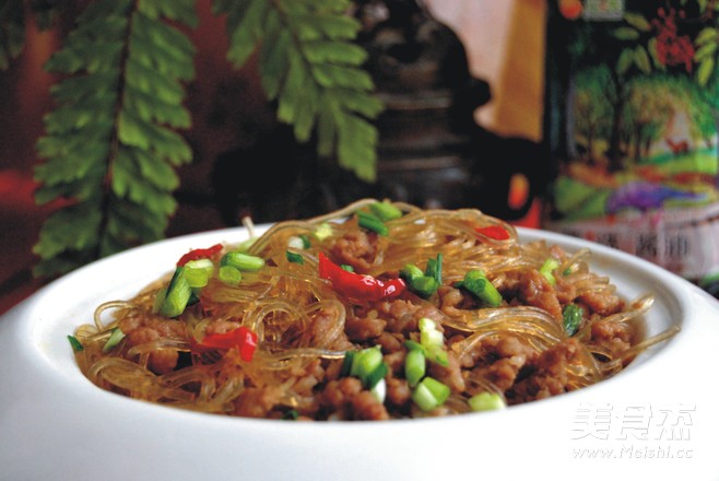 粉丝里富含碳水化合物、膳食纤维、蛋白质、烟酸和钙、镁、铁、钾、磷、钠等矿物质。 有良好的附味性,它能吸收各种鲜美汤料的味道,再加上粉丝本身的柔润嫩滑,更加爽口宜人。 用肉末与粉丝搭配后,真是一如既往的美味~ 主料 粉丝1把 猪肉末200克 辅料 酱油少许 小米椒1只 料酒少许 葱花少许 鸡粉少许 盐少许 肉末粉丝的做法 1. 准备好所有的食材后 2.将粉丝泡软剪短 3. 炒锅烧热,放油后加入猪肉末煸香 4.加料酒和酱油和适量水煮开 5.加入粉丝,煮至汤水略收后 6.加少许盐、鸡粉调味,撒上葱花和小米椒即可 7.出锅装盘、上桌、开吃~ 烹饪技巧 粉丝含铝很多,一次不宜食用过多。