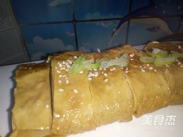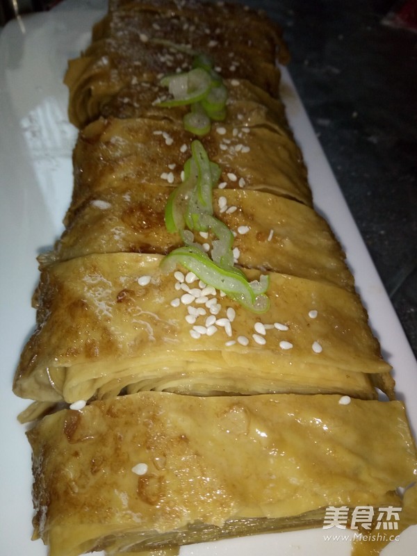3.展开豆油皮刷一层刚刚煮好的汁料,正反面都要刷到,依次把三张都刷好,叠放在一起卷起来