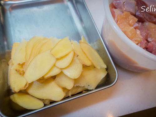 3、把鸡肉加入盐,米酒,太白粉略为腌过。