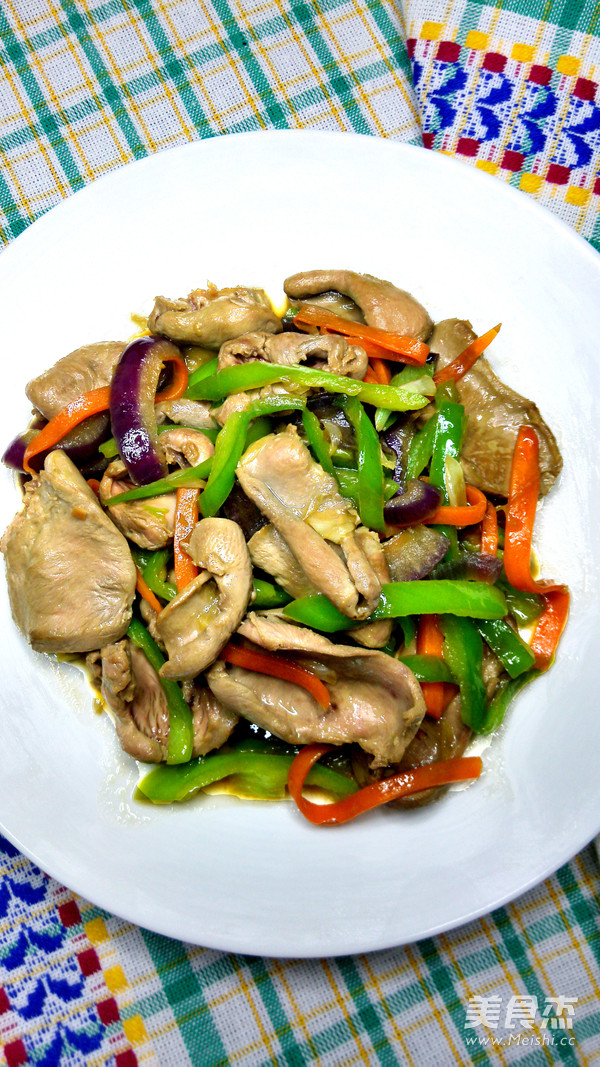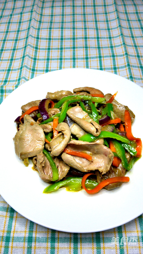 8.下鸡心片,加辅料中所有调料,快速翻炒三十秒后盛出即可