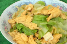 3、另起锅,放入适量食用油,油热之后倒入打泡的鸡蛋液,煎至七成熟,煎好后后锅铲划成小块,倒入包菜,大火翻炒一分钟左右,最后调入适量鸡精炒匀即可。