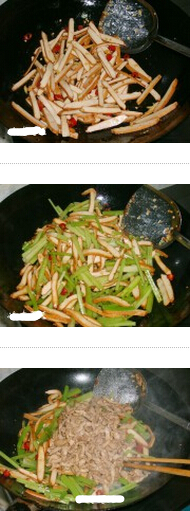 香干芹菜炒肉丝的材料:瘦肉300克,芹菜50克,香干200克,姜,泡椒,食用盐,干淀粉,蚝油,鸡精,色拉油,清水少许 香干芹菜炒肉丝的做法: 1.瘦肉切丝,加干淀粉、蚝油及少许清水拌匀稍稍腌一会儿;芹菜切寸断;香干切长条;姜切成末;泡椒切开。 2.炒锅倒油,开小火,下肉丝,用筷子将其扒拉散,至肉丝变色后将其捞出控油。 3.锅内留底油,下姜末及泡椒末炒香。 4.下香干翻炒。 5.加少许盐炒约1分钟后下芹菜,大火爆炒约半分钟。
