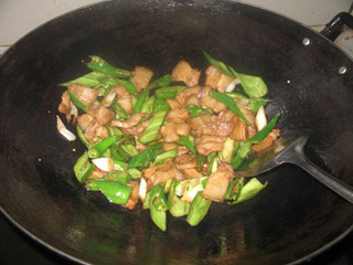 辣椒炒肉,是湘菜里的一道经典家常菜,每家每户都会做的一道菜,而且每家都有自己的做法和绝招,呵呵。记得有次再朋友家里吃过这道菜,非常简单的做法,几乎没用啥特别的调料,味道却出奇的好,赶紧偷学了,回来做做,果然可以。电视里说烹饪协会定了湘菜的标准,辣椒炒肉辣椒和肉的比例要3:5,不知道这个规矩对不对,如果中餐都像西餐一样,都进行量化了,那么,是好事还是坏事呢,嘿嘿。花了8块钱买了半斤五花肉,还有1块钱的辣椒,一道不算贵又好吃的辣椒炒肉就出炉了。”
