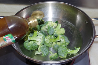 3 先锅里倒水放入洗净的西兰花氽熟(加入适量高汤调料、盐、料酒)