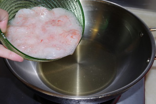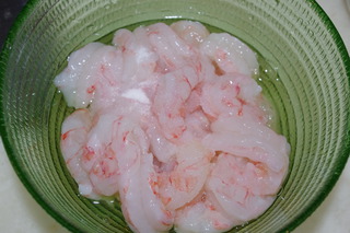 2 虾仁用刀开背,取净虾线,放入一个蛋清和适量盐,搅拌均匀后放一旁入味15分钟