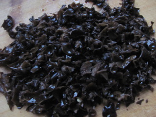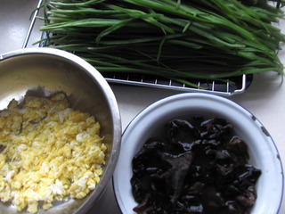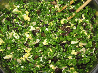 6 放到拌好的鸡蛋.木耳盆里加盐.味精.姜末.花生油搅拌均匀,素三鲜馅就好了。