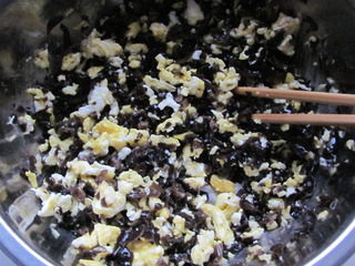4 和虾皮一块拌到炒好的鸡蛋里。