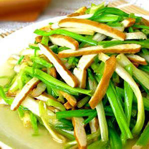 3、锅中放油烧热,煸香葱姜丝后,捞出煸过的葱姜丝扔掉,倒入香干,煸炒一分钟左右