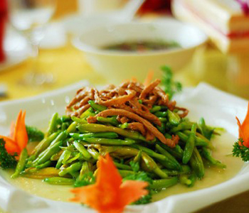 2、洗净切丝,起油锅加几片姜入肉丝煸炒;