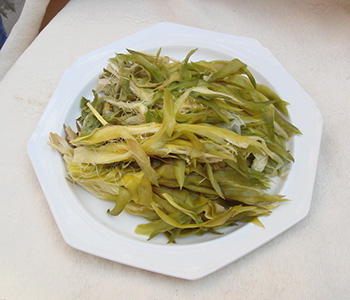 1、鲜黄花菜择洗干净,放入沸水中稍烫,捞出,控净水分,撒上少许精盐略腌;