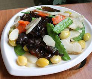 2、炒锅烧热放入熟花生油,烧至七成热,即将冬菇、荸荠片同时下锅煸炒,放入酱油,姜末,精盐,白糖,味精,料酒,鲜汤150克,烧开用湿淀 粉勾芡,淋熟油起锅装盘即成。
