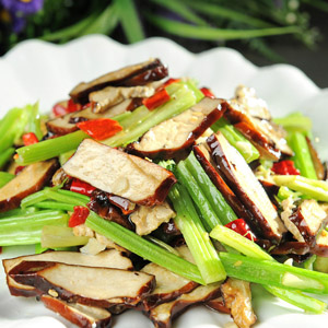4、锅放油,爆香姜丝后,放入香干煸香,再放入芹菜后,关小火,立即调入盐;鸡精;胡椒粉;生抽,开大火爆炒后放入肉丝,出锅前,淋入香油即可。