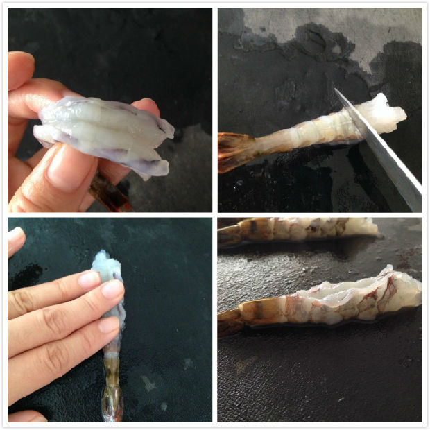 1 虾去皮,只留虾尾,背部轻轻划开,剔去虾线