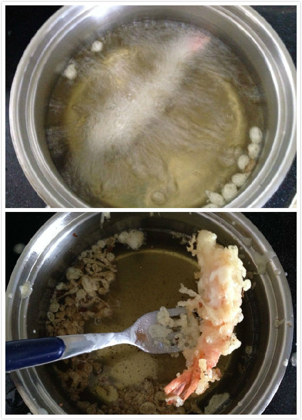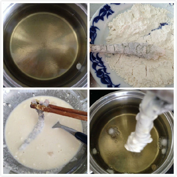 14 中途用叉子扶住虾,另一只手用筷子蘸面糊淋在虾上,完成甩丝。