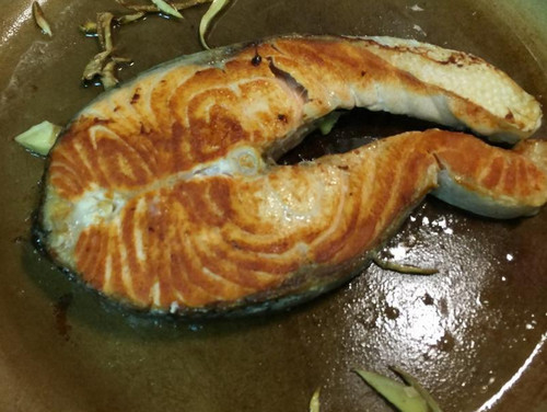 2、倒入少许油.放入姜丝一起煎鲑鱼.(去鱼腥味).等两面煎焦香。
