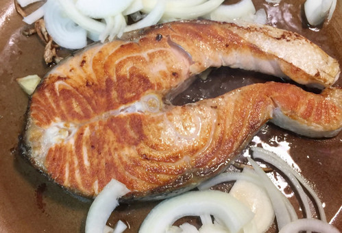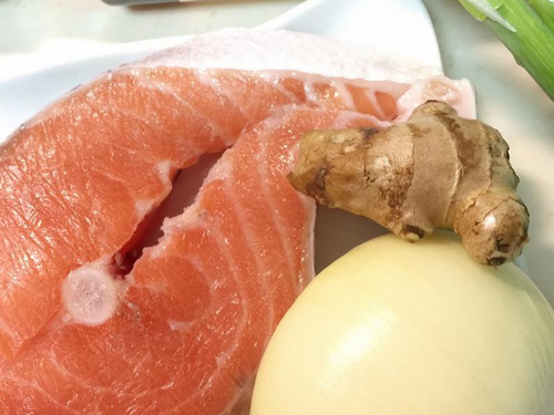 主料:鲑鱼一片,洋葱半颗,葱2根,蒜一根,辣椒一根,姜丝2片