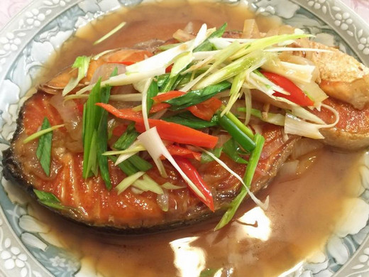 因为现在人都忙碌余工作,所以就把这道洋葱鲑鱼简单化,用鲑鱼片料理,不需用到大量的油炸,烹煮,用简单的煎和水来煨煮.避免吃掉太多油脂.简单又健康喔!。
