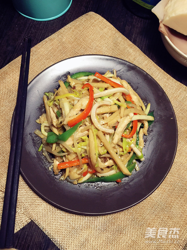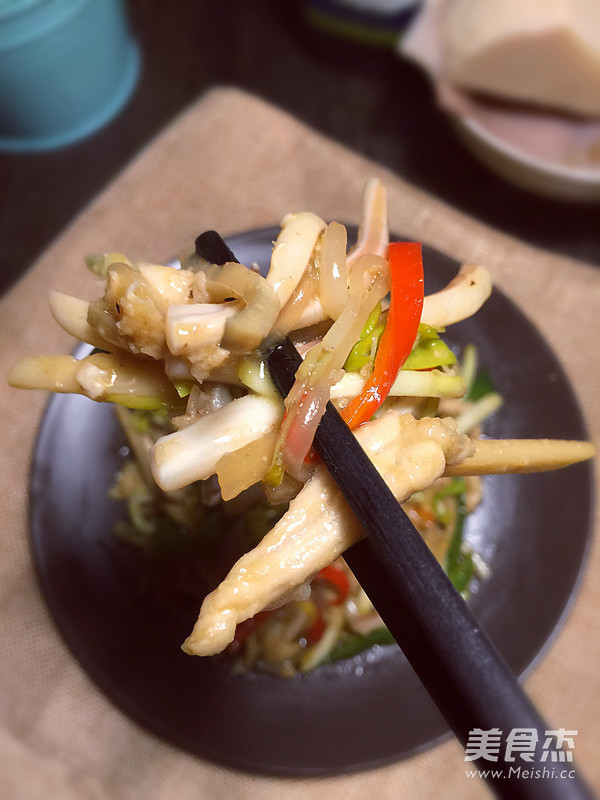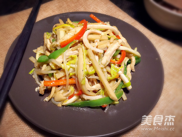 肉丝120克 鱿鱼1个 冬笋80克 蒜黄50克 绿豆芽50克 柿子椒半个 红椒半个