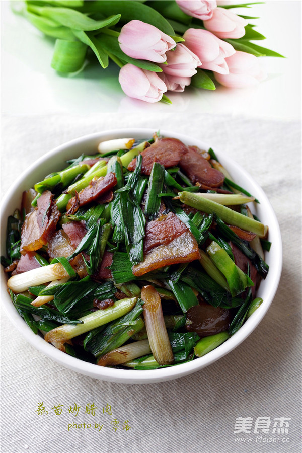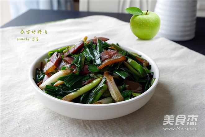 5.锅里倒入适量植物油,烧热后放入姜蒜丝炒香,再放入腊肉下锅炒出油分;