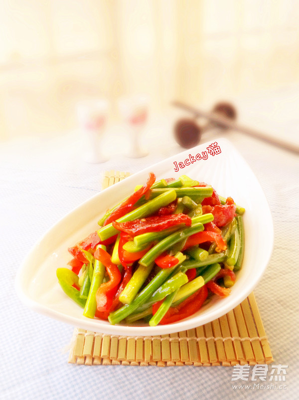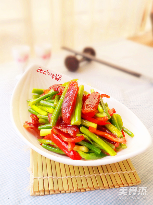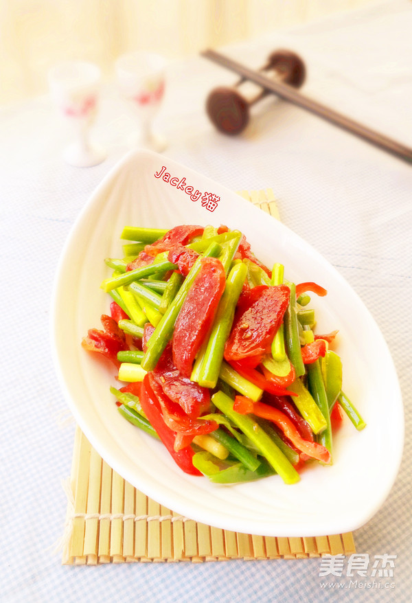 LG今晚回家吃饭,猫特意提早半小时下班到市场买菜,可转了大半圈,也没买到想买的菜,想着家里还有腊肠没吃完,直接买些蒜苔和青红椒一起炒炒吃,蒜香味,香辣味,再加上腊肠的香腊味,好吃简单快手