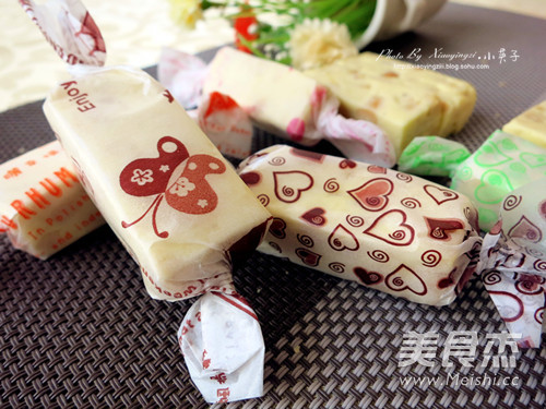 15.放在案板上,按喜欢的大小先切成条再按糖纸大小切成块,包上糖纸即可
