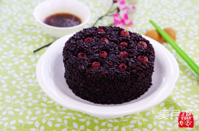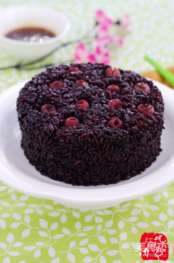做这个米饭之前我就想最后整个莲蓬似的造型,所以一起蒸了些莲子,本想着蒸米饭时顺便把莲子隔水蒸熟,白白的莲子插在墨米饭上肯定挺好看的,结果没想到蒸饭的水没过了蒸屉把莲子给染色了,不过最后插上去感觉这颜色也不错似的哈哈。墨米饭我做的甜口的,最后吃的时候再淋上些玫瑰酱,味道赞赞,老人孩子肯定更爱吃。