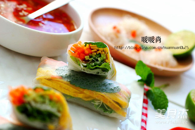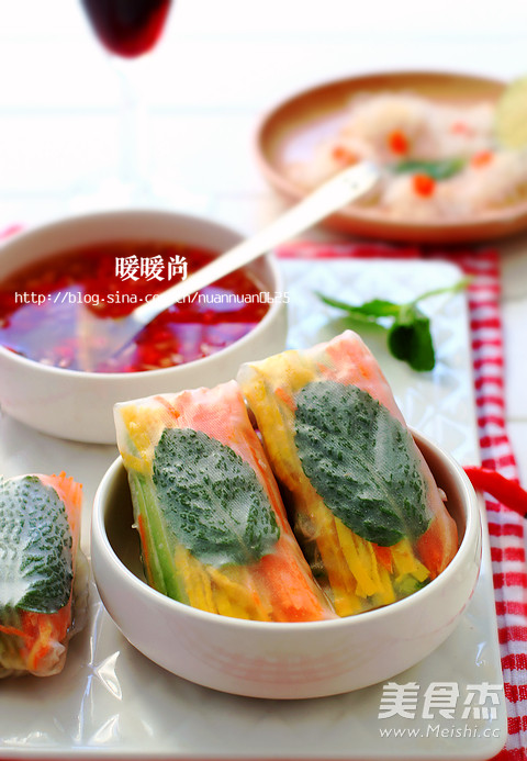 为什么选五彩银丝卷这道菜呢?春节大家为了喜庆家宴一般都会备比较多的荤菜,而往往最受欢迎的却是那道最不起眼的素凉菜。今天的五彩银丝卷说白了就是素版越南春卷,里面用到了薄荷叶、胡萝卜、黄瓜、鸡蛋、越南细河粉、生菜等6种食材,配上鱼露、青柠、朝天椒和小红葱头调的汁,整道菜既有黄瓜、胡萝卜和生菜的脆爽,还有薄荷与青柠的清新,再加上蘸料的酸辣,看似做法简单,但味道层次异常丰富,绝对会成为家宴上的点睛之笔!另外,将这么多的春意盎然的食材一起包裹在春卷皮里有迎春纳福之意,也祝愿大家来年春风得意、福气满满!