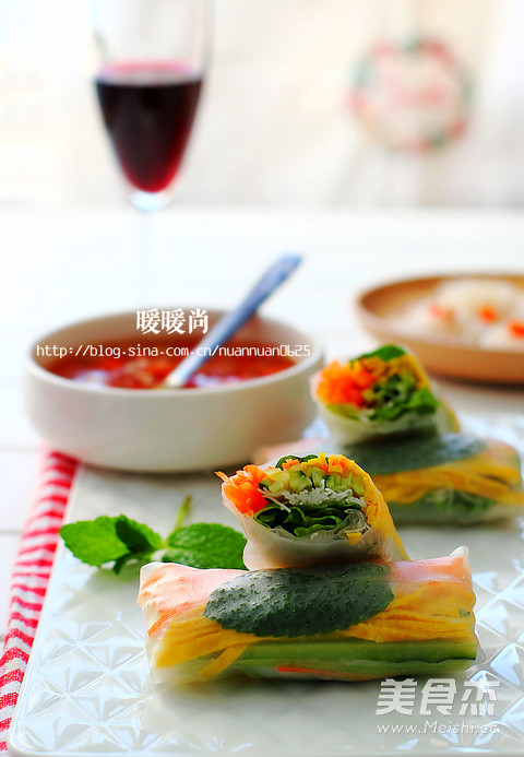 8.最后再从下往上卷成卷即可,吃的时候沾上调制好的鱼露汁食用。(卷卷的时候为了让里面的蔬菜看起来来更加通透,我将图示刀子盖住的那部分春卷皮切掉了,自己吃就随意了)