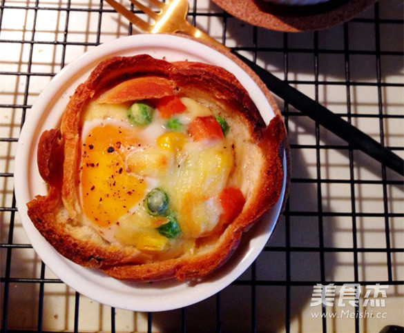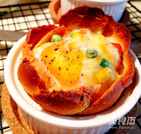 简单味美 主料 吐司2片 芝士5克 鸡蛋1个 辅料 黑胡椒1茶匙 盐1茶匙 吐司鸡蛋杯的做法 1.吐司用擀面杖擀薄一点,把四个角切一刀,类似风车的样子,将切好的吐司片放进烤碗 2.放入一点杂菜、芝士碎 3.打一个鸡蛋 4.撒上黑胡椒、盐,再放上一点杂菜、芝士碎 5.烤箱中层180度25分钟
