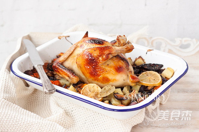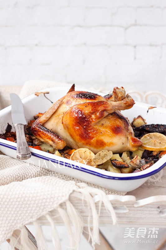 8.将剩余的洋葱、胡萝卜、土豆、香菇、柠檬放入烤盘中,然后将鸡放在蔬菜上,鸡腿尾部和翅尖用锡纸包裹一下;