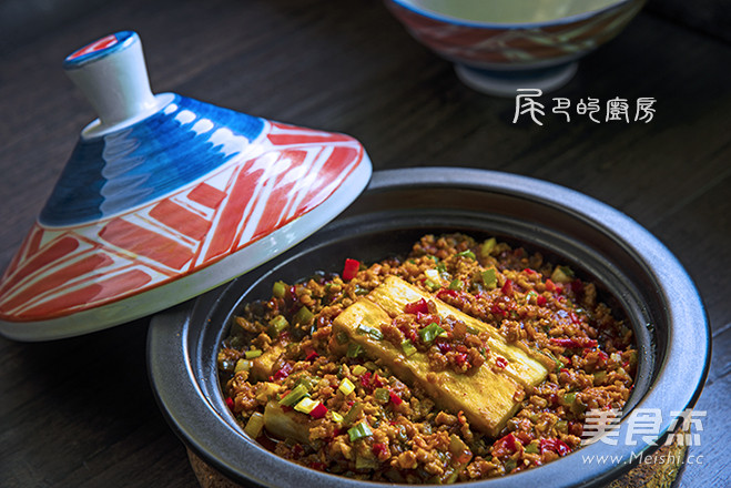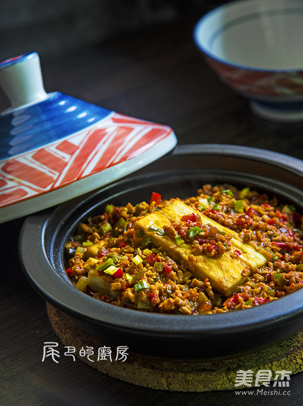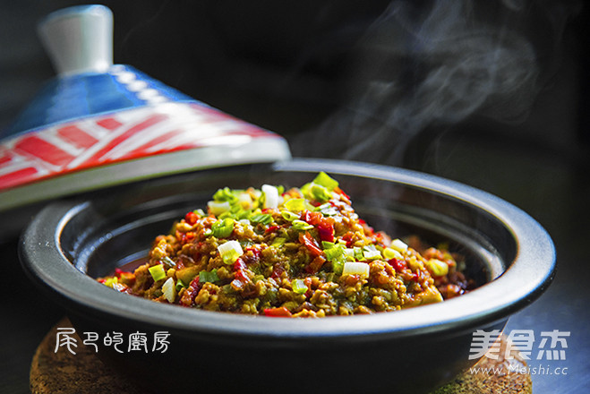 5.将茄条码入塔吉锅中,加入炒好的肉馅