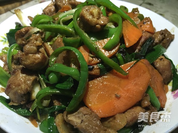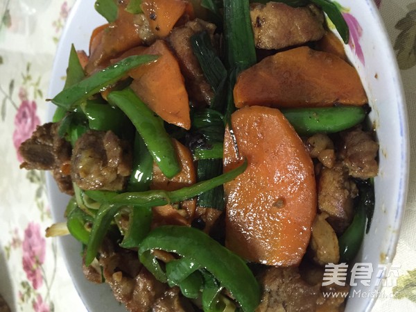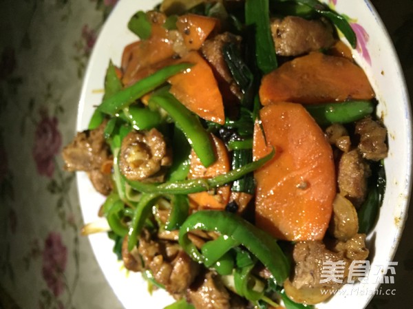 最爱的辣椒红萝卜排骨,来到了广东这边就很少吃啦,水热,容易上火,这二天天气凉了,马上做来解解馋。。 辣椒红萝卜排骨的做法 1.准备好排骨,用生抽,生粉,油腌十分钟,再爆炒一会,有些变金黄色时再加少量水焖十分钟左右,就再装起来,我是早上先用油焖熟后,晚上再用来炒的 2.准备好配菜 3.青椒切好 4.先干炒红萝卜,炒软即可 5.加一点点盐炒软辣椒 6.烧红锅后放油爆爆姜蒜 7.将事先焖好的排骨炒炒 8.再加红萝卜炒炒 9.加蒜继续炒 10.再加蒜叶 11.最后加青椒 12.调味即可上碟