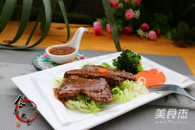 9. 生菜洗净沥干水,切细丝摆在碟子上,再铺上牛扒,这样的的目的让牛扒的酱汁流入生菜里,吃起来美味,荤素搭配更健康,也让牛扒看起来更丰满好看