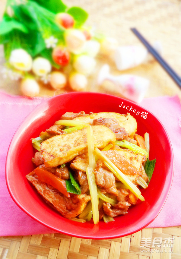 1.准备食材,瘦肉切片后加入适量的盐,糖,味极鲜,食用油,生粉腌制,香芹切段,油豆腐切大厚片,蒜苗,红萝卜切片备用