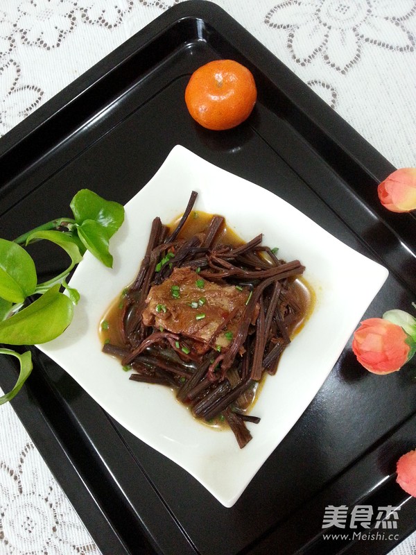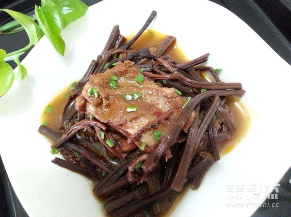 8.15分钟后,排骨、蕨菜已经软烂,将葱段、蒜瓣、姜片挑出,排骨和蕨菜盛出备用