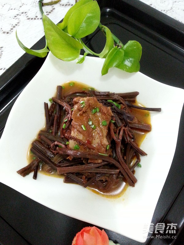 根据自己的喜欢,来添加豆瓣酱的量,排骨要选用半肥半瘦的,做出来才会好吃。蕨菜,我用的是干品,如果直接放入高压锅,要注意水的添加量,因为干蕨菜吸水量大一些。如果换成鲜蕨菜,鲜蕨菜是绿色的,则可以在炒豆瓣酱时加入蕨菜,以保持蕨菜的口感和鲜味。