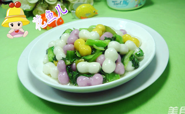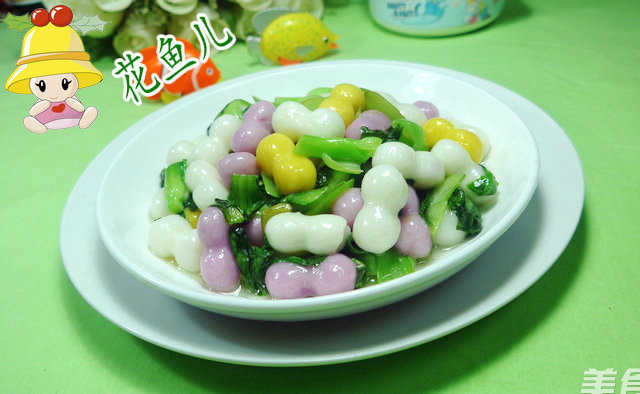 这种三色年糕果去年买过一次,昨天和老公一起去麦德龙超市买一些东东。走到冷冻区时,又看到了三色长生果年糕,还是觉得挺好看的就买了,这次是配上菜芯炒来吃吃。。。