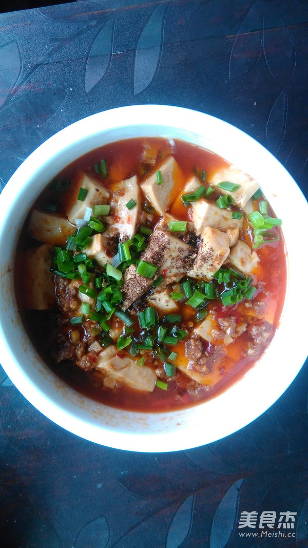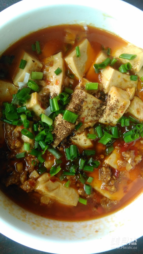 9.起锅时淋一点水豆粉让豆腐更嫩滑好吃,最后装盘是上面放点花椒面,小葱香味特别香。