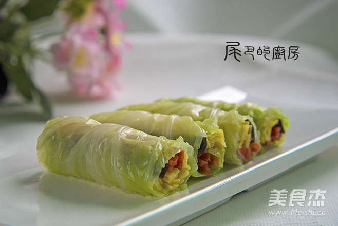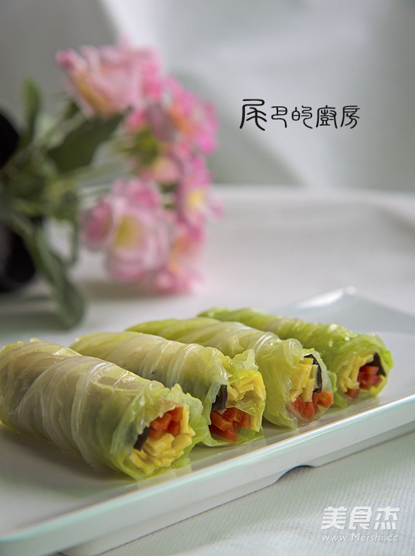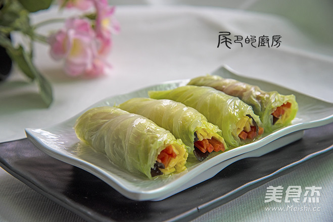 4.将胡萝卜丝、木耳丝、蛋皮丝放在白菜叶上卷成卷 两端切整齐,在盘中码放整齐。 调味料兑成汁,浇在白菜卷上即可。