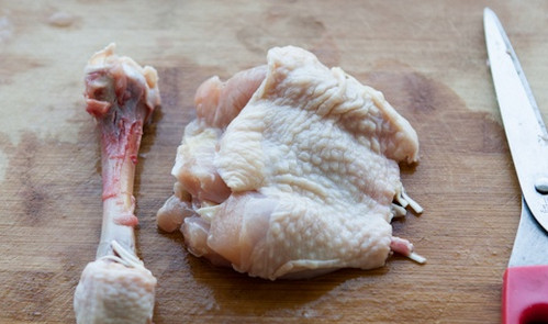 2、从开口处用剪刀贴着骨头向上把鸡肉剪开。