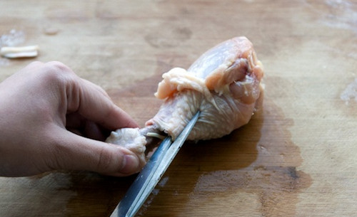 3、用剪刀把骨头周围连接的肌肉组织全部剪开,直到只有骨头顶端与鸡肉连接。