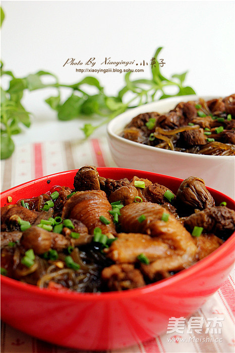 小英子心语: 1. 粉条需要提前泡软,这样再放入锅里煮的时间短也不容易煮化。 2. 炖鸡的时候放上些山珍会使汤的味道更鲜美。 3. 炖煮的时间与买的鸡的品种养殖时间长短有关,所以一开始的时候水可以多加点,中途最好不要加水。