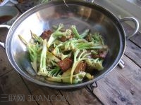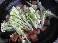 家常菜谱配图 主料: 花菜,五花肉 辅料: 蚝油,花椒,葱,姜,蒜,酱油,料酒 温馨提示: 1、可以添加干红椒,味更赞。 2、菜花在锅中不必炒至太软,因为移中干锅中会再次加热。 制作步骤: 1.准备食材。 2.将菜花洗净,用刀切或用手撕成长段。 3.五花肉加少许酱油、料酒腌制十五分钟左右。 4.锅中放少许油,加入腌好的肉片煎炒。 5.至两面都略带焦黄,肉片略打卷,加入适量花椒。 6.炒香后,加入葱姜蒜片略炒。 7.加入花菜。 8.翻炒至略变软,加入适量蚝油,炒匀关火。 9.将炒好的菜花放入干锅中食用。