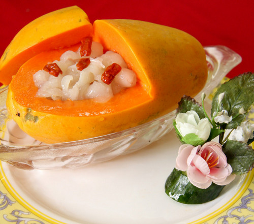原料:熟木瓜600克,新鲜牛奶3杯,莲子肉25克,红枣2枚,冰糖适量。