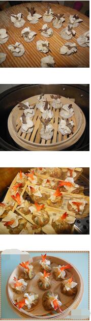 4.取一张馄饨皮包入馅料,另取一只凤尾虾仁一起收口包好,虾尾露在烧卖中间,在笼屉底部抹薄油放入烧卖,也可以玉米皮抹薄油排好烧卖,放入入蒸锅蒸格,大火开火蒸8分钟。