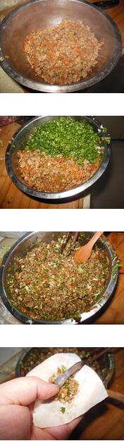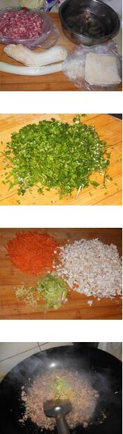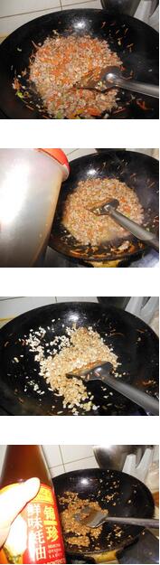 2.锅预热加入食用油下入肉馅翻炒,下入胡萝卜翻炒均匀,下入1茶匙盐,点入1调羹生抽翻炒均匀盛出备用。